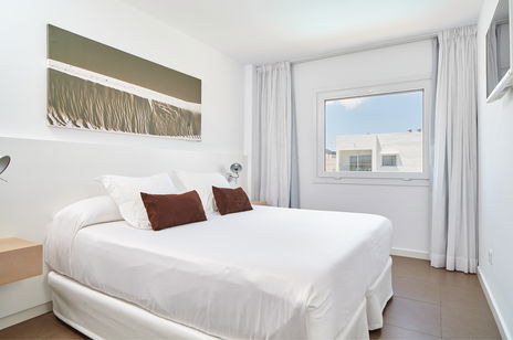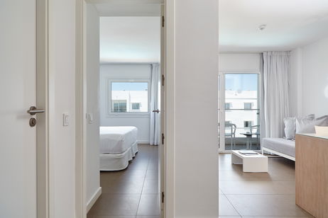 Capacious Junior Suite with 38 m². Maximun occupancy 3 pax. Air conditioning. 32' Satellite flat-screen TV in the living room and bedroom. Double or twin bed with 0,91 * 1,91 sofa bed. Fully equipped kitchenette with toaster, microwave, refrigerator, coffee maker, vitroceramic hob. Dining and sitting área. LED ambient lighting. Safety box free of charge. Bathroom with hair-dryer and walk-in shower and amenities. Free Wi-Fi access